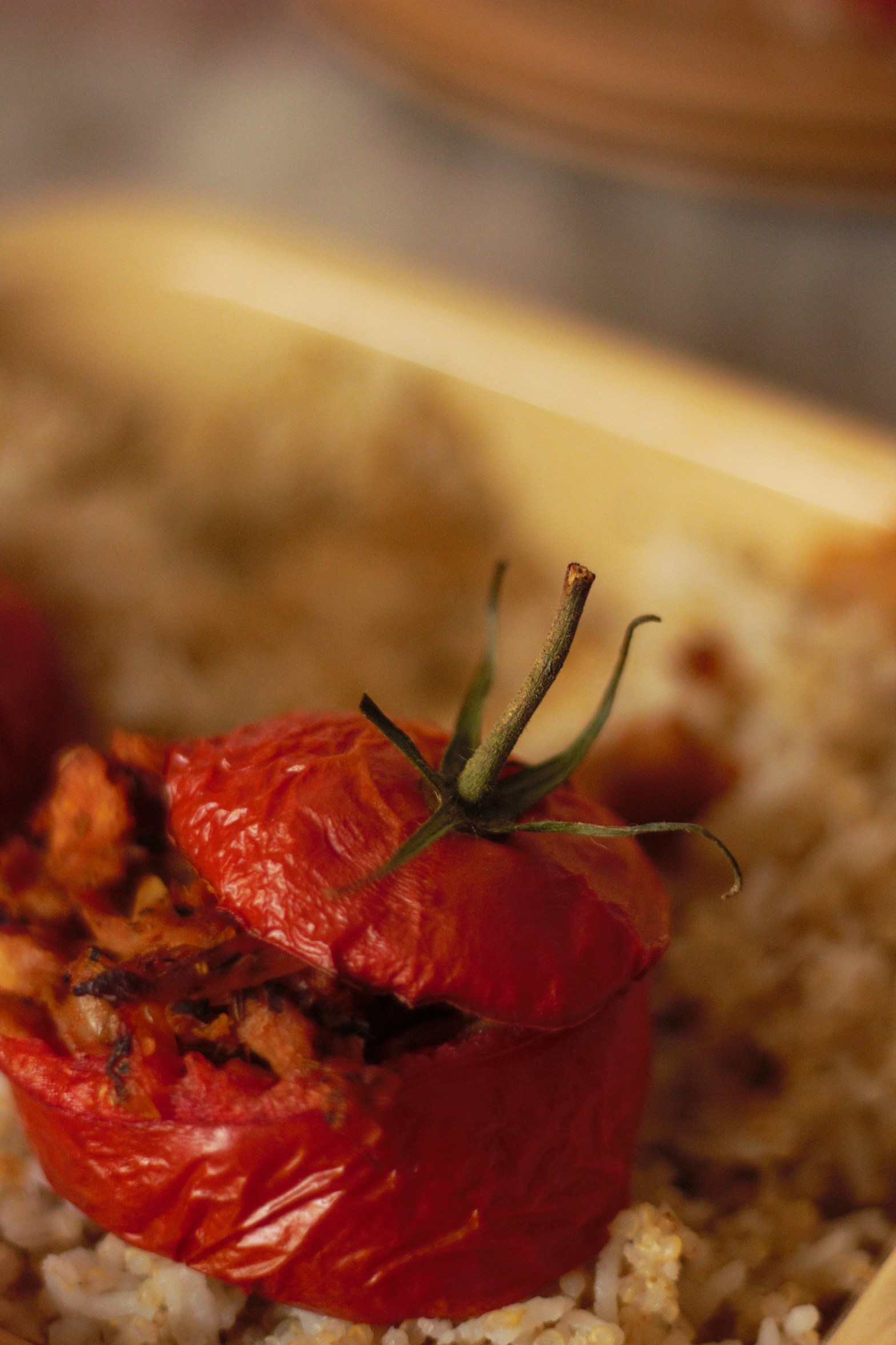 Dépose les tomates dans un plat et rempli chacune d’elles jusqu’au bord et dépose le chapeau par-dessus la farce. Il permet de ne pas la brûler.