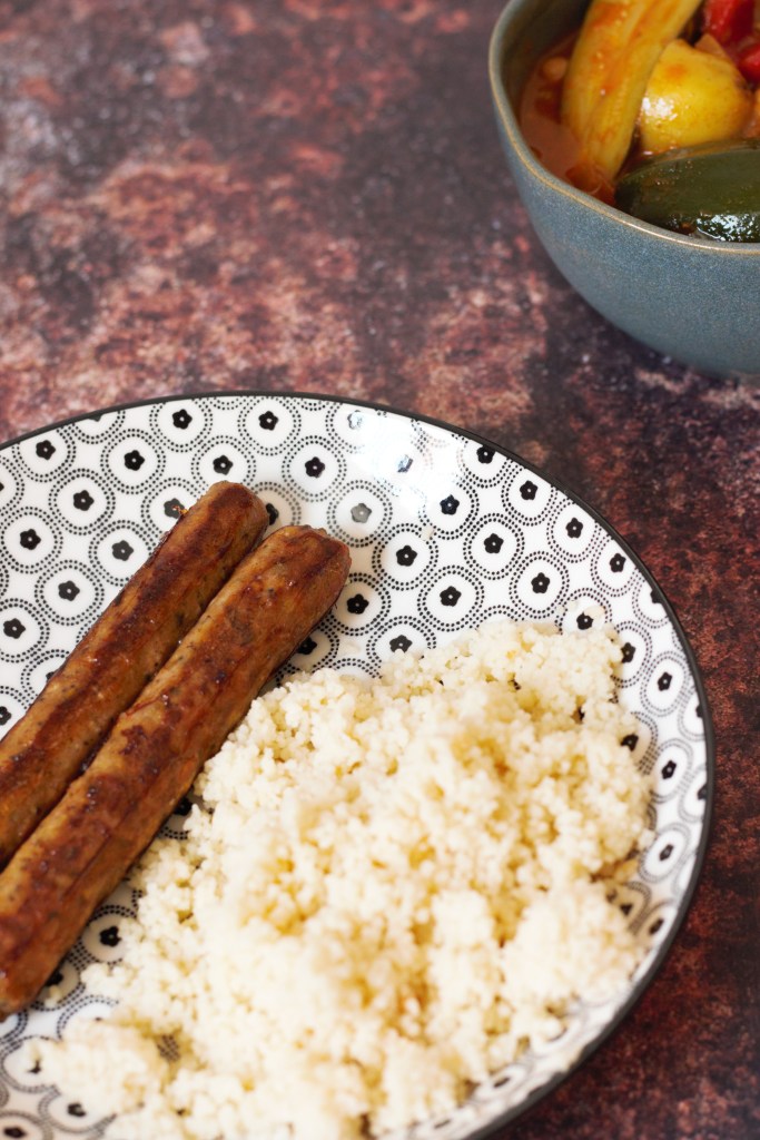 Ici j’ai choisi de mettre de l’huile de noix au lieu de de l’huile d’olive dans ma semoule pour les oméga 3 en plus de son goût délicieux ! J’ai aussi ajouté des chipo vegan de la marque Les nouveaux fermiers