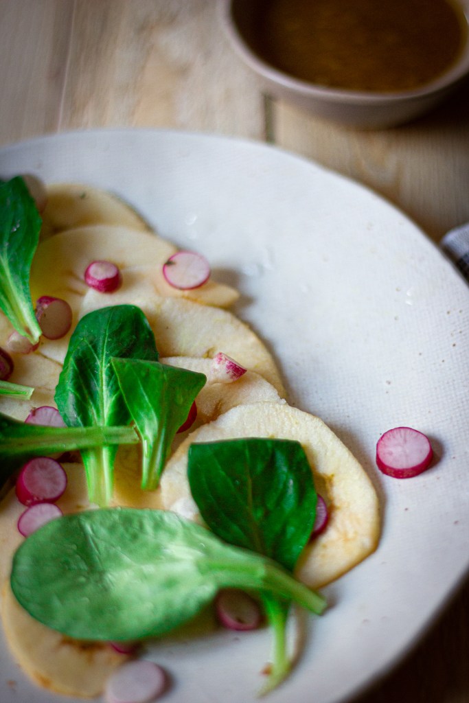 J’ai voulu proposer ce carpaccio de pomme pour un cours de cuisine en collaboration avec 123 Veggie et je l’ai adoré, elle est toute simple et fait son petit effet sur la table !