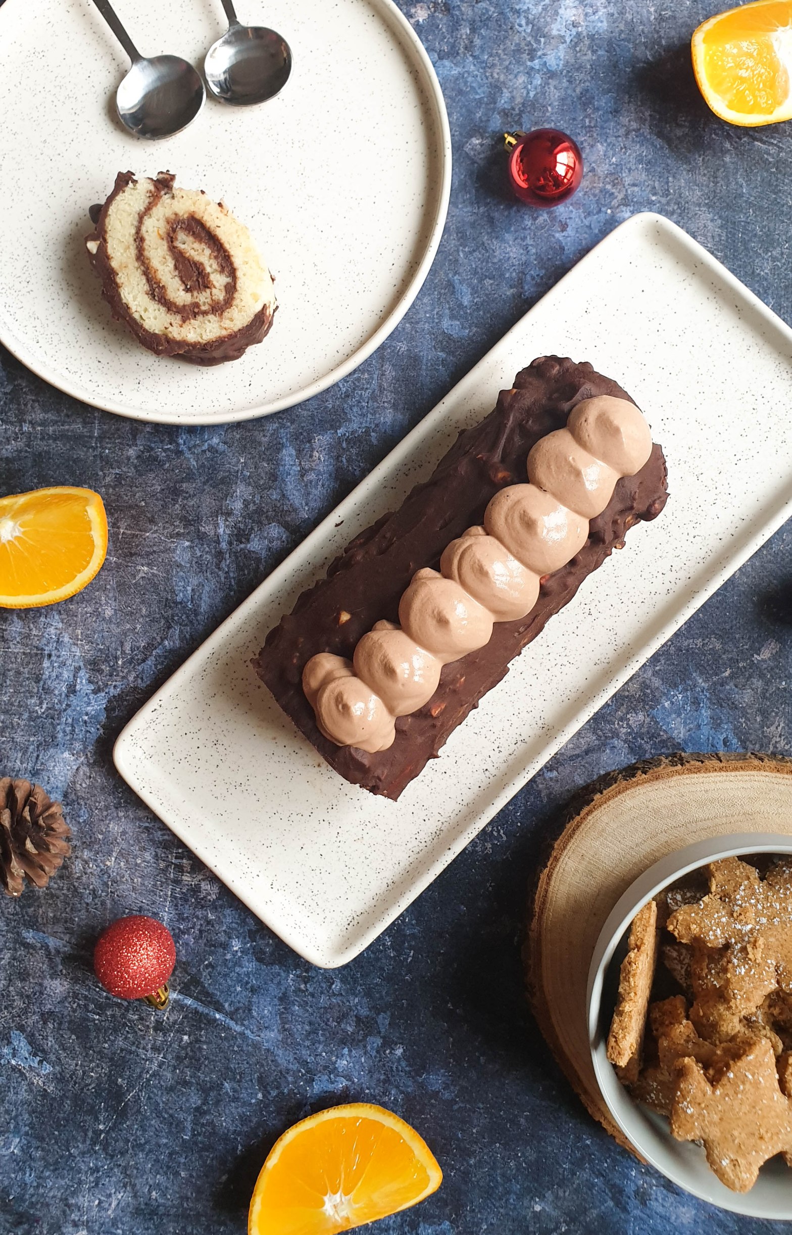 Buche de Noël chocolat orange avec ganache montées sans coco, génoise roulée et ganache